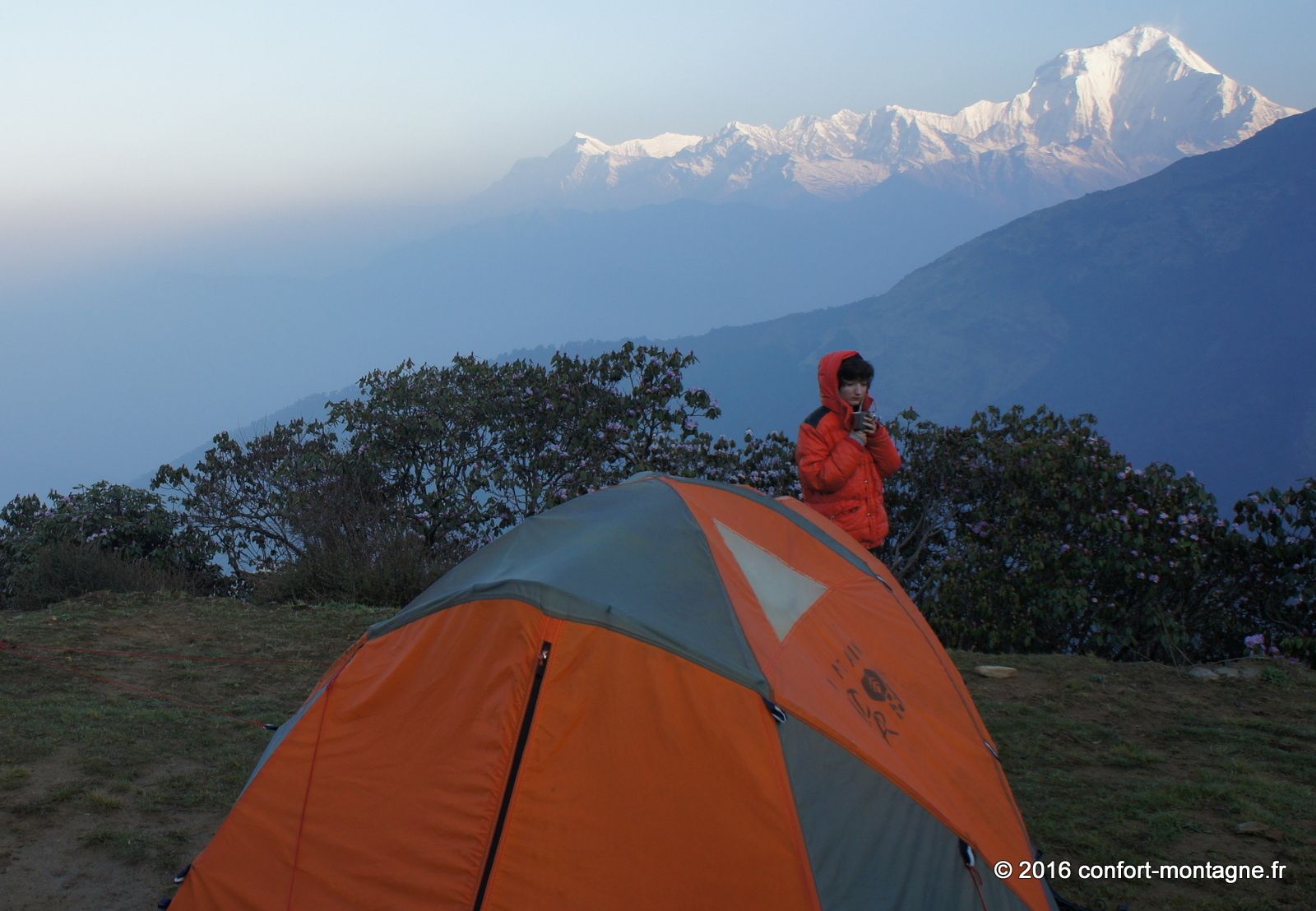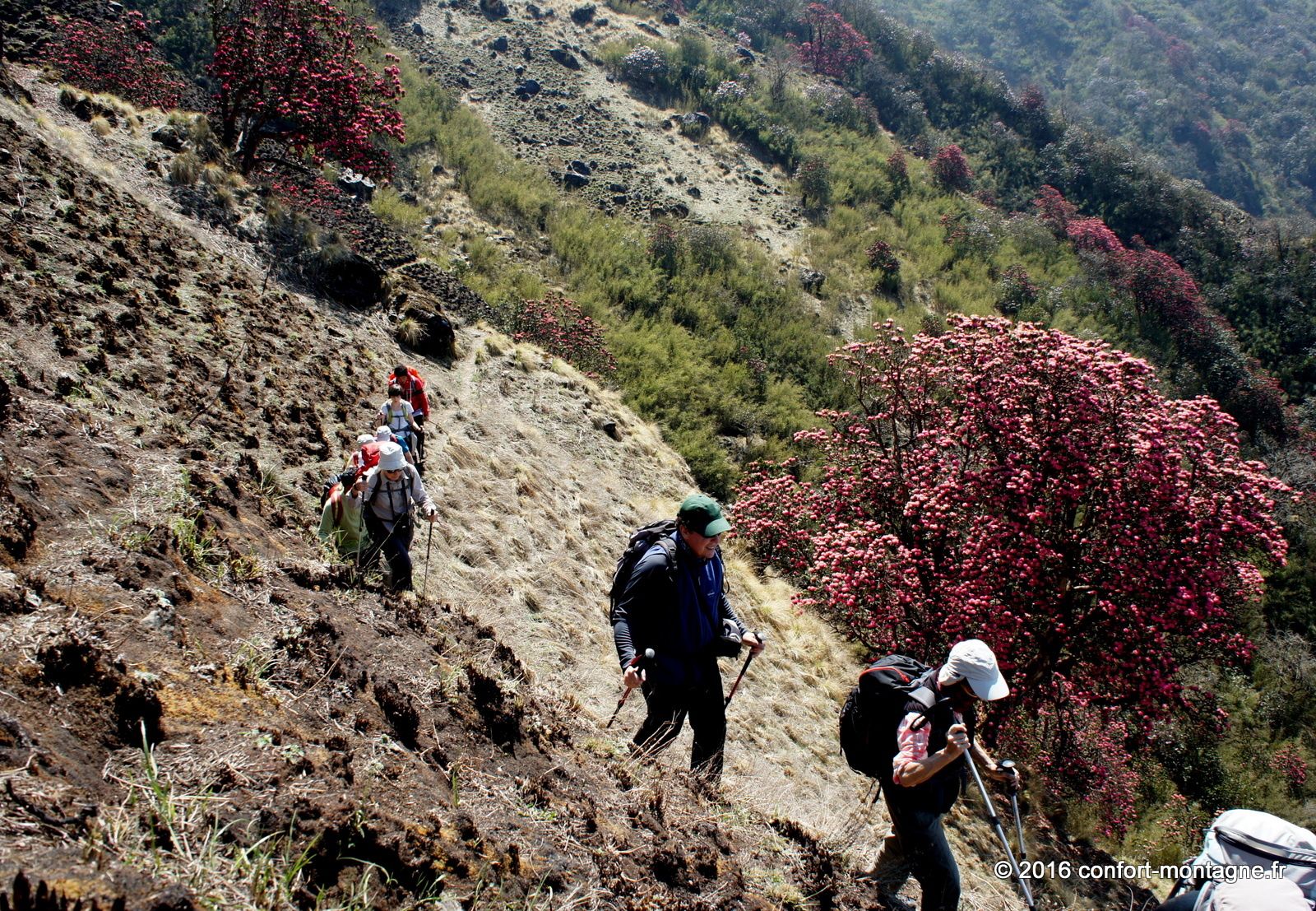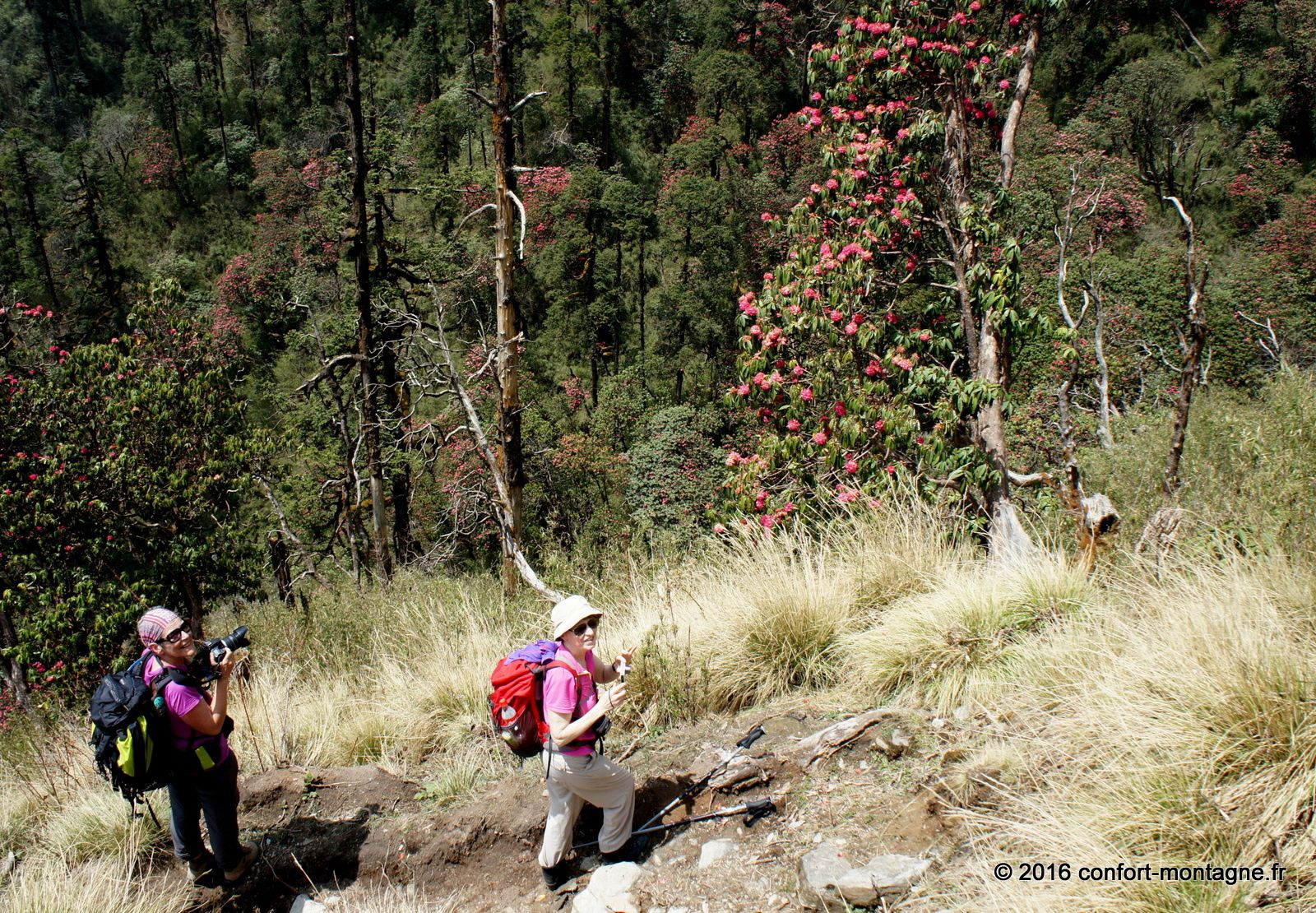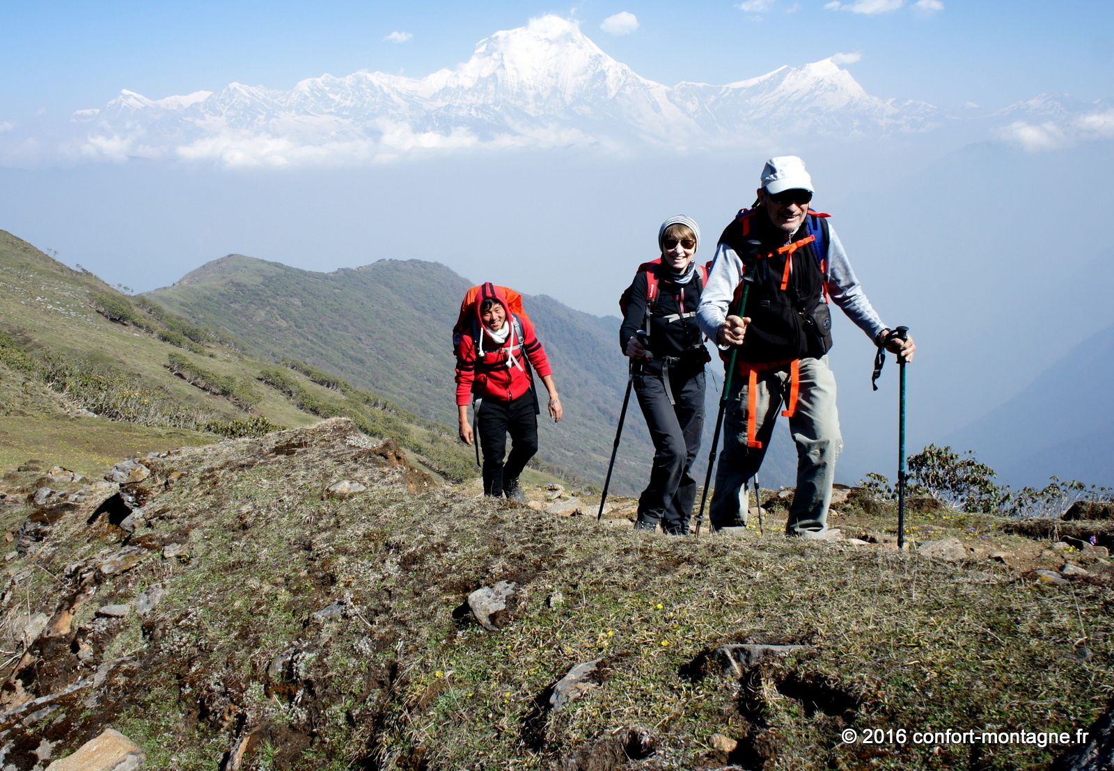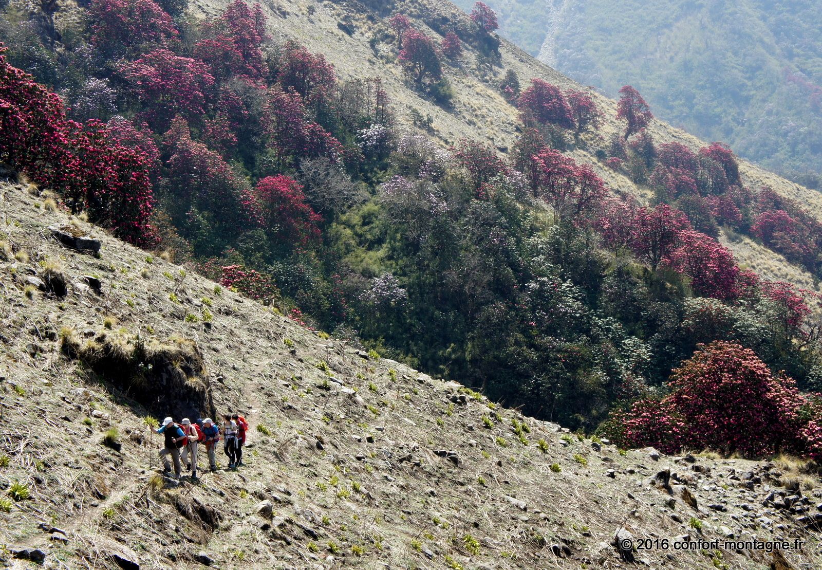Quel spectacle ! L'effort fourni par chacun, la solidarité du groupe, le rythme lent et régulier de notre marche pour parvenir dans ce lieu magique nous remplisent d'émotion. Nous rejoignons ensuite un sentier descendant, rarement utilisé autrement que par les locaux, pour rejoindre le village de Ghorepani, sur la route classique du tour des Annapurnas. Un chemin de retour qui nous comblera, à travers les épaisses forêts de rhododendrons et les villages. Les points de mire sont fantastiques sur les montagnes. Au passage par Poon Hill (3193 m) nous profitons du superbe lever du soleil sur un panorama majestueux qui s’ouvre du Dhaulagiri Himal (8167 m) à la "Queue de Poisson" ou Fish Tail, le surnom du Machapuchare (6997 m). Un retour plein d'entrain et d'échanges avec notre équipe locale composée de 22 personnes. 13 porteurs et 9 Sherpas (cook et staff guides). Ils auront vraiment été à la hauteur ! Toujours présents et attentionnés, ils ont grandement participé à la réussite ce séjour. Merci Kalu (Notre Sirdar Guide), Subash (Assistant Guide), Prem (Notre Chef cuistot), Wanglama (Assistant cuisine), Beshal, Lakpa Titung, Mengmar Dorje, Mengmar Titung, Mengmar Sherpa et les porteurs...