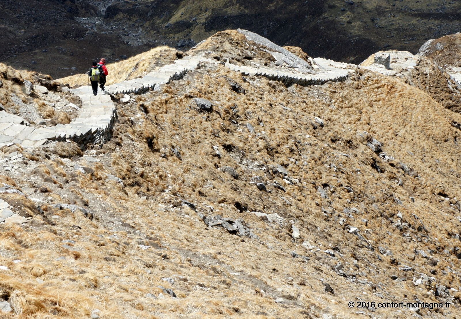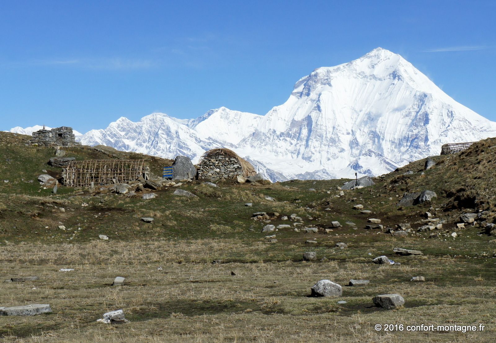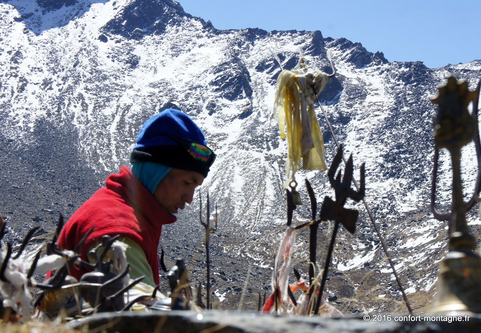 Malgré la faible distance séparant notre campement du lac sacré, connu sous le nom de Pautarko Kaire, nous sommes fatigués à cause de l’altitude... Après une nuit passée à 4200 mètres d'altitude dans nos tentes où la température est descendue à -7°C, nous franchissons maintenant les 4600 mètres et découvrons enfin ce "sacré" lac ! Le chemin n’est pourtant pas difficile puisque nous suivons un long escalier de pierre ; magnifique, il témoigne du travail des Népalais, de leur hardiesse... Le festival Badau Purnima y est organisé ici sur les rives au cours des mois d’août et de septembre. Les villageois viennent assister à cette cérémonie religieuse spéciale dédiée à Lord Shiva (le dieu de la destruction célèbre pour son trident). Durant cette fête, ils offrent en sacrifice des moutons et autres animaux et prennent un bain dans les eaux glacées du lac. Le panorama est extraordinaire et comprend l’Annapurna Sud (7219 m), tout proche à quelques kilomètres mais dont l’ascension prend des semaines, ainsi que les sommets de Fang (Bharha Chuli à 7647 m). Au-delà des profondeurs de la vallée de la Kali Gandaki, c'est le Dhaulagiri Himal qui domine enfin toute la ligne d’horizon vers l'ouest.
