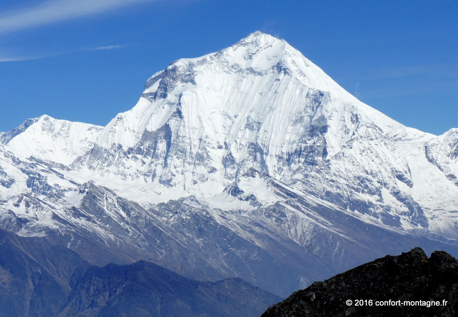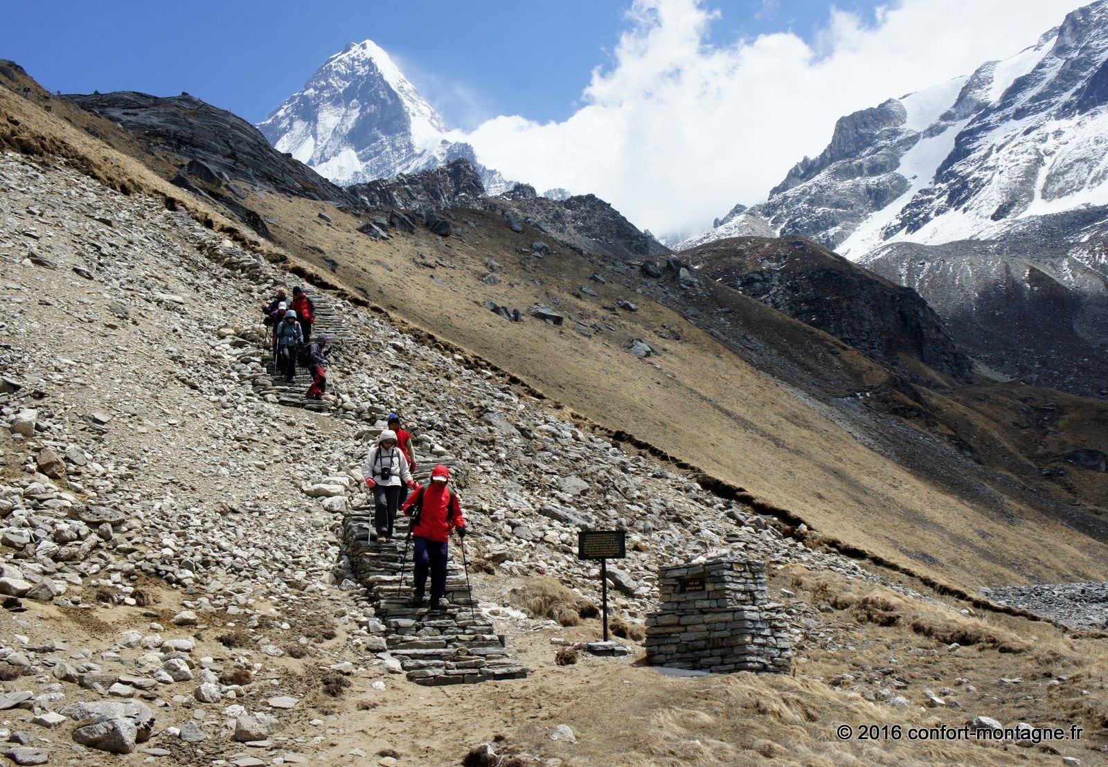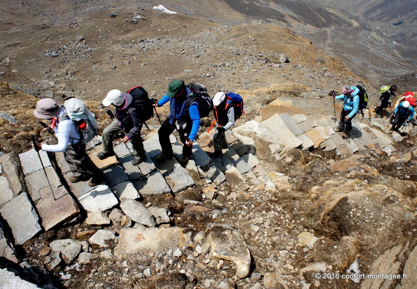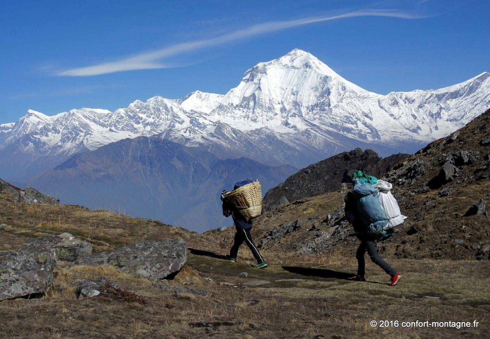 Malgré la faible distance séparant notre campement du lac sacré, connu sous le nom de Pautarko Kaire, nous sommes fatigués à cause de l’altitude... Après une nuit passée à 4200 mètres d'altitude dans nos tentes où la température est descendue à -7°C, nous franchissons maintenant les 4600 mètres et découvrons enfin ce "sacré" lac ! Le chemin n’est pourtant pas difficile puisque nous suivons un long escalier de pierre ; magnifique, il témoigne du travail des Népalais, de leur hardiesse... Le festival Badau Purnima y est organisé ici sur les rives au cours des mois d’août et de septembre. Les villageois viennent assister à cette cérémonie religieuse spéciale dédiée à Lord Shiva (le dieu de la destruction célèbre pour son trident). Durant cette fête, ils offrent en sacrifice des moutons et autres animaux et prennent un bain dans les eaux glacées du lac. Le panorama est extraordinaire et comprend l’Annapurna Sud (7219 m), tout proche à quelques kilomètres mais dont l’ascension prend des semaines, ainsi que les sommets de Fang (Bharha Chuli à 7647 m). Au-delà des profondeurs de la vallée de la Kali Gandaki, c'est le Dhaulagiri Himal qui domine enfin toute la ligne d’horizon vers l'ouest.
